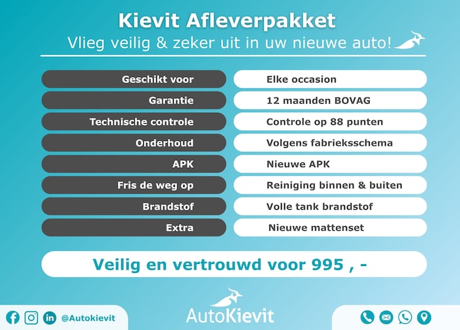 Ons AutoKievit Premium afleverpakket, inclusief 12 maanden Bovag garantie; een volle tank brandstof; een volledige servicebeurt waarbij uw auto op 88 punten wordt gecontroleerd; en complete reiniging van de auto is EUR 995,-.