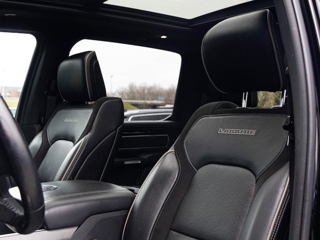 Hij is stijlvol en comfortabel, deze Dodge Ram 1500, en hij is ontworpen om u veilig en comfortabel te laten rijden onder alle omstandigheden. De aandrijving wordt verzorgd door een achtcilinder motor en een automatische transmissie. Kent u het gevoel van een elektrisch bediend glazen panorama dak? Wij zeggen: licht, lucht en ruimte. En dan hebben we het nog niet eens over de luxe sensatie van het lederen interieur. Voorzien van zowel stoelverwarming, verwarmbare achterbank alsook een verwarmbaar stuur, zorgt dit voertuig voor uitstekend comfort tijdens koude dagen. U wordt in deze auto ook getrakteerd op 20 inch lichtmetalen velgen, LED koplampen, geluidsisolerende ramen, elektrisch inklapbare buitenspiegels, in delen neerklapbare achterbank en LED-achterlichten.