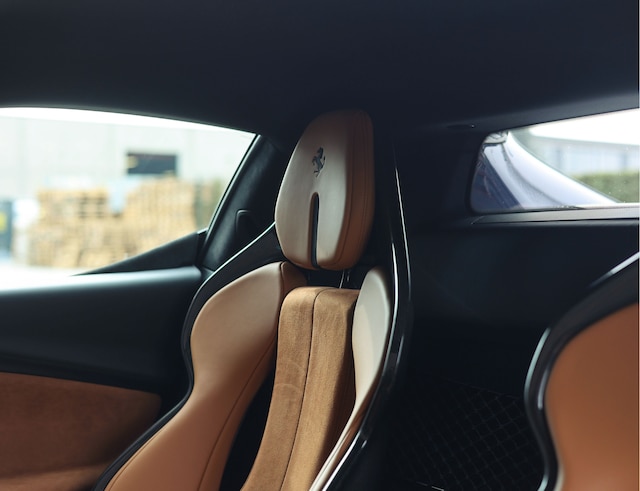 Binnenin heerst een sfeer die warm en sportief tegelijk is. De Cuoio Alcantara bekleding brengt een klassieke touch in het interieur, maar is volledig verweven met het moderne minimalistische Ferrari ontwerp van nu. De carbon racing seats ondersteunen u ideaal voor zowel lange ritten als intensief rijden, terwijl het dashboard in Nero een rustig contrast vormt dat de aandacht naar de weg houdt. De afwerking met Cuoio stiksels, Alcantara details en de in zwart gestikte Cavallino’s laten zien hoe zorgvuldig dit interieur is samengesteld.