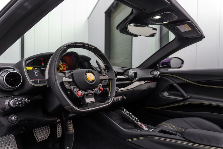 Dit prachtige exemplaar is uitgevoerd in het zeer zeldzame ‘Viola Hong Kong’, een diepe paarse metallic lak die perfect tot zijn recht komt op de elegante en krachtige lijnen van de Ferrari 812 GTS. Het interieur is uitgevoerd in ‘Nero’ leder en afgewerkt met ‘Giallo’ details. Deze combinatie komt ook subtiel terug in het exterieur met zwarte velgen en gele remklauwen, wat zorgt voor een sportieve en tegelijk stijlvolle uitstraling.