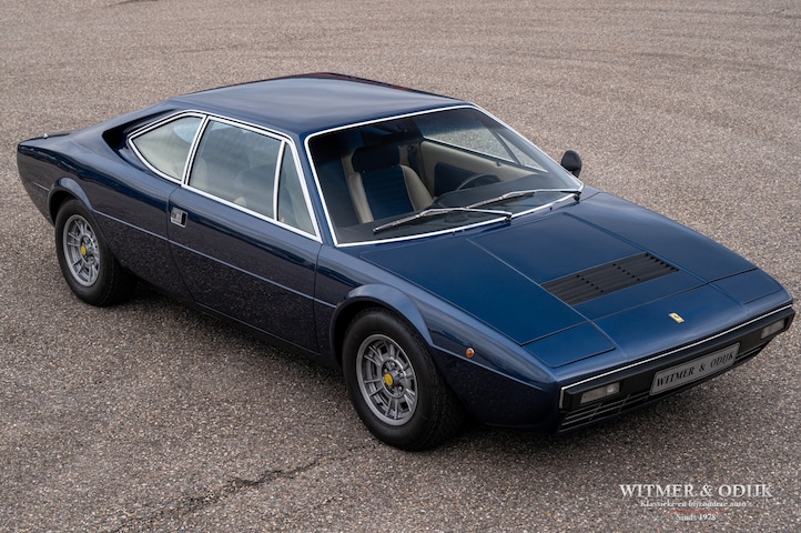 De 308 GT4 is de enige serie geproduceerde Ferrari die werd ontworpen door Bertone, en dat is te zien ook. Marcello Gandini tekende de auto met zijn strakke lijnen en scherpe hoeken. Hierdoor had de GT4 veel weg van de eveneens door Gandini ontworpen Lancia Stratos en Lamborghini Urraco. Bij Pininfarina waren ze niet echt blij met de keuze van Enzo voor Bertone, immers bij ieder productiemodel had Pininfarina tot dan toe bergen werk verzet. Het resulteerde in de afwijkende GT4 Bertone, een ontwerp wat vrienden en vijanden kent. Zeker in niet rode kleuren is het een bijzondere en markante verschijning, misschien had Gandini er alles aan gedaan om de auto juist niet in het Ferrari rood mooi te laten zijn. Juist in het hier getoonde Blue Sera is de GT4 een schoonheid, het prachtige two-tone interieur accentueert dit in hoge mate. Deze GT4 hoef je niet eens te rijden om er van te genieten, wat een uitstraling heeft de auto. NIet alleen dankzij de fraaie kleurstelling, ook de hoog glanzende lak en tal van perfecte details maken deze GT4 hoogst begeerlijk. Een zeldzame vondst waarvan ik nog heb overwogen deze aan de privé collectie toe te voegen, maar zo is mijn bedrijf ontstaan en met deze auto maak ik echt iemand blij. Optisch een tien, technisch uitstekend onderhouden en dientengevolge perfect rijdend. Uiteraard roestvrij, altijd schadevrij gebleven en zelfs nog beschikkend over het originele interieur. Dit laatste zegt iets over het zorgvuldige gebruik. De originele boordmap met service- en instructieboekjes is aanwezig evenals onderhoudsfacturen. Voor de Nederlandse liefhebber; de auto heeft een kenteken wat in donkerblauwe kentekenplaten uitgevoerd mag, dus geen lelijke gele platen op deze schoonheid. Zie de foto's voor de kwaliteit van de vele fraaie details, zo zijn de Cromodora velgen onbeschadigd en vrij van remstof, het aanwezige chroom is hoog glanzend, de voorruit heeft een donkerblauwe zonbeschermer en de bumpers hebben geen enkel veegje. Deze 308 GT4, met 3ltr motor (in Italië werden ze om fiscale redenen ook verkocht met 2ltr motor) is echt een zeldzame en zeldzaam fraaie Dino die in deze staat niet of nauwelijks te vinden is, en zeker niet in deze kleur. Er zijn slechts 2826 GT4's gebouwd, met een nadruk op rood mogen we concluderen dat er wereldwijd misschien nog enkele tientallen in blauw bestaan. Kom gewoon even kijken, samen genieten. Let ook nog even op de unieke positie van de stoelen in de GT4, ver naar voren als in de latere Mondial en zelfs Gallardo, dit biedt een rijervaring die zich lastig laat beschrijven. Stukje rijden?