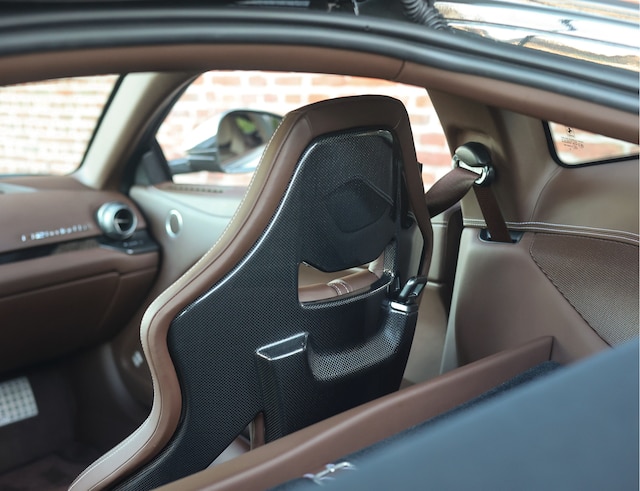 Dit exemplaar is daarnaast bijzonder fraai uitgevoerd. De eerste eigenaar heeft via het Atelier-programma deze auto volledig naar zijn smaak laten maken. Het exterieur gaat gehuld in Grigio Scuro lakwerk, wat prachtig aangevuld wordt door de matte donkerzilveren 20” velgen met daarachter Grigio Silverstone remklauwen. Uiteraard zijn de karakteristieke Scuderia Shields aanwezig op de voorschermen.
