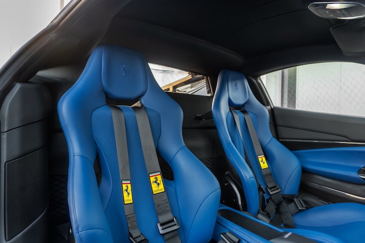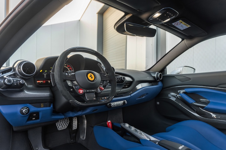 Ook het interieur is tot in detail samengesteld binnen het Tailor Made programma. Uitgevoerd in ‘Blu Elmo’, gecombineerd met ‘Nero’ leder en alcantara, ontstaat een bijzonder stijlvol en contrastrijk geheel dat perfect aansluit bij het unieke exterieur en zijn historische inspiratie.
