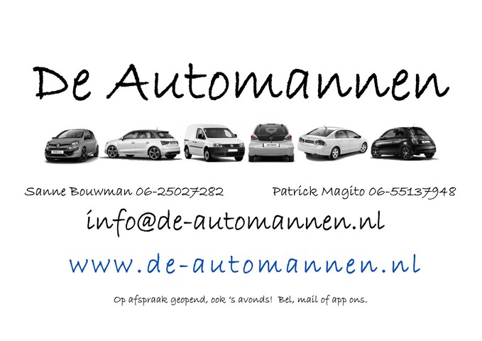 Voor een afspraak voor bezichtiging, een proefrit, taxatie van uw inruilauto of gewoon meer informatie; bel, mail of Whatsapp met Sanne op 06-25027282 of Patrick op 06-55137948. We zijn van 09.00 uur tot 19.00 uur op beide nummers te bereiken. Een email sturen kan ook: info@de-automannen.nl