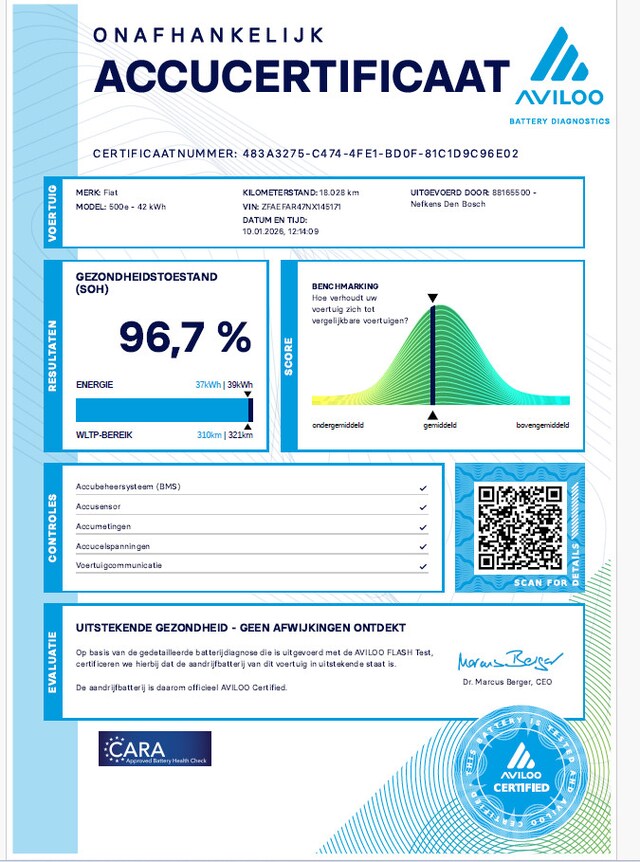 Intelligente technologie. Geen emissies en een fantastisch rijgedrag. Welkom in de Fiat 500. Op een volle acculading kan deze auto de gebruikelijke dagelijkse ritten allemaal maken. Het opladen gaat eenvoudig aan een openbare laadpaal of aan uw eigen oplaadpunt thuis. Op de teller van deze auto staat slechts 18024 kilometer. Voorin is het 's winters genieten met de verwarmbare voorstoelen voor zowel bestuurder als bijrijder. Het glazen panoramadak zorgt ervoor dat u zich omringd voelt door de omgeving. Tot de uitrusting behoren ook 17 inch lichtmetalen velgen, Full LED koplampen, extra getint glas, in delen neerklapbare achterbank, LED-achterlichten en snelheidsafhankelijke stuurbekrachtiging.