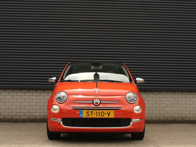 Leuke origineel Nederlandse Fiat 500 in de gelimiteerde Anniversario uitvoering met diverse unieke uitrustingsdetails zoals de retro lichtmetalen velgen, retro logo's en speciale bekleding. Het glazen panoramadak geeft een mooi lichtinval en dit zomergevoel wordt verstrekt door de Arancia Sicilia metallic lak.