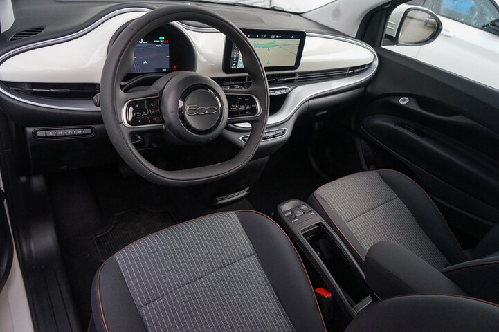 Met het digitale dashboard heb je essentiële info in beeld. Altijd, overal. Deze Fiat 500e is voorzien van remote services. Via je smartphone bedien je diverse functies ook op afstand en krijgt je informatie over de status van je auto. Gemakkelijk en veilig is de bediening het audiosysteem en het full map navigatiesysteem met knoppen op het stuur. De audio-kwaliteit is geweldig, dankzij de DAB-ontvangst. Met automatische airconditioning hoef jij alleen de gewenste temperatuur in te stellen. Het systeem doet de rest. Parkeersensoren zijn een handig hulpmiddel om parkeerschades te voorkomen. Je bent in deze Fiat ook voorzien van regensensor, cruise control, keyless entry, lederen stuur, centrale deurvergrendeling met afstandsbediening en boordcomputer.