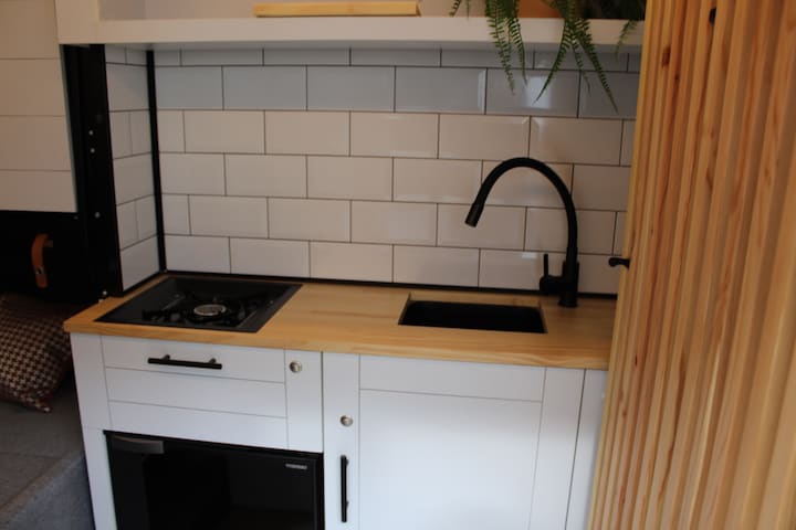 Onder andere voorzien van spoelbak met kraan, watertanks schoon/vuil, gasfornuis, chemisch toilet (draagbaar), koelkast, binnen-en buitendouche, opbergruimte, bank, dubbel bed, tafel etc.