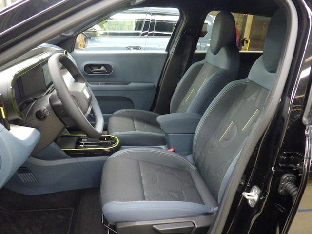 - Stoelbekleding – blauwe en zwarte “Base” stof met gele stiksels