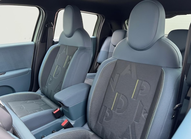 Interieur: Blauwe stof met gele stiksels én panda-logo, Stof