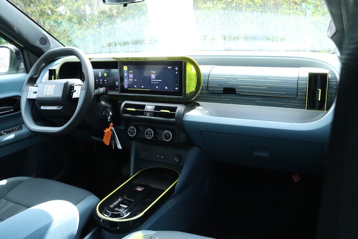 - Doorschijnend gele omlijsting rond het touchscreen, geïnspireerd door Lingotto