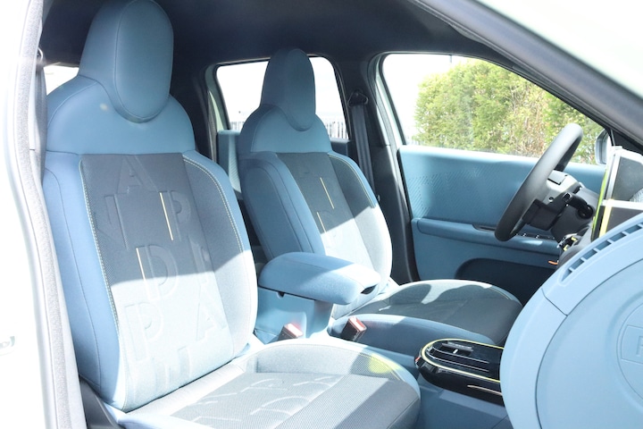 Interieur: Stoelbekleding – blauwe en zwarte “Base” stof met gele stiksels