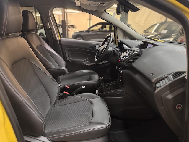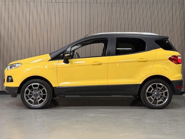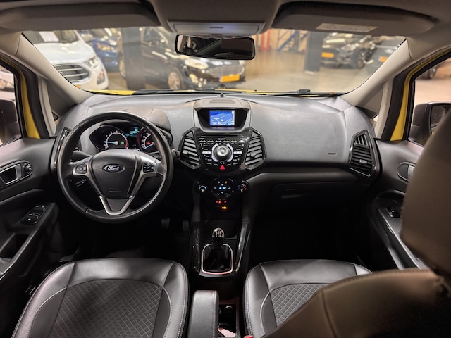Luxe en zeer complete 125pk EcoSport Titanium Edition met Zwart contrasterend Dak, Zwarte Spiegelkappen, 17" Lichtmetalen velgen, Privacy Glass, Half Lederen Bekleding icm. Verwarmbare Voorstoelen, SONY Premium Radio CD & USB, Bluetooth & Voice control, Climat control, Elektrische Voorruitverwarming, Cruise control, Parkeersensoren, Aut. Regen- & Dimlichtsensor, Keyless Entry & Start.