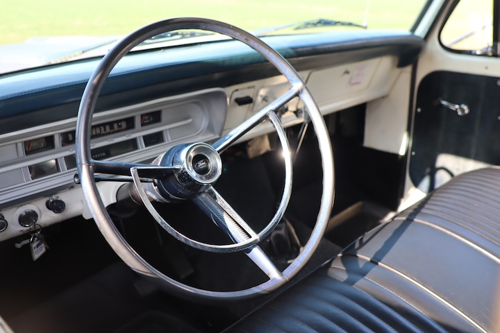 The F-100 was available as a two-piece standard cab with a choice of Styleside or Flareside loadbed, in both short and long wheelbase versions. Both variants were available with rear-wheel drive or four-wheel drive. Depending on the year of manufacture, various engines were available: two six-cylinder engines (240 and 300 cubic inches) and four V8 engines (302, 352, 360 and 390 cubic inches). For the transmission, customers could choose between a Cruise-O-Matic 3-speed automatic, a 3-speed manual or, later, a 4-speed manual, depending on the engine and drive system.