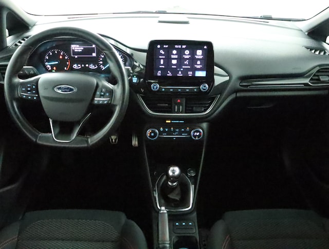 De Ford Fiesta van het nieuwe type. Al jarenlang de best sturende auto in zijn klasse. Zeker deze ST-Line met aangepast onderstel, vering en demping. Ook aan de buitenkant is meteen te zien dat dit de sportieve telg van de Fiesta-familie is: speciale bumpers, sideskirts en 17" lichtmetalen velgen. Binnenin gaat de sportieve sfeer door met sportstoelen met rood stiksel, een met leder afgewerkt stuurwiel, pook- en handremhoes, en een zwarte hemelbekleding.