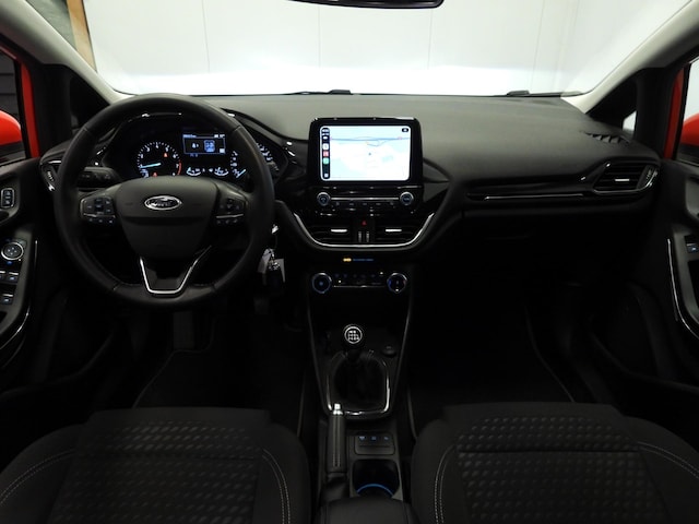 Handig en veilig: Connected Services. Alle vitale functies en data van de auto checkt u via de app op uw smartphone. In deze Fiesta vindt u niet alleen schakelaars op het stuur om het audiosysteem met DAB-ontvangst te bedienen, maar er is ook spraakbediening. De climate control zorgt onder alle omstandigheden voor een prettige temperatuur. Met de aanwezige parkeersensoren weet u altijd zeker of het past. Het luxeniveau in deze Ford is niet alleen gericht op comfort, maar ook op uw veiligheid. Tal van sensoren helpen u om de omgeving in de gaten te houden. De automatisch inschakelbare verlichting zorgt dat automatisch de verlichting wordt ingeschakeld als het donker wordt, wat bijvoorbeeld in tunnels erg handig is. En de regensensor zet de ruitenwissers aan zonder dat u eraan hoeft te denken. En deze auto heeft ook cruise control, automatisch dimmende binnenspiegel, isofix-aansluiting, centrale deurvergrendeling met afstandsbediening, boordcomputer en lederen versnellingspook als standaard uitrusting.