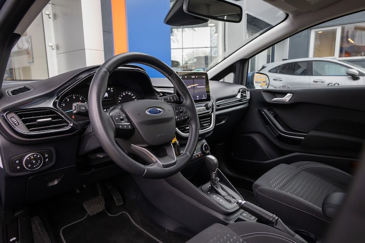 Go Further. Mooi motto van Ford. En ze maken het waar ook. Met zijn benzinemotor en automatische transmissie is dit een prima auto voor nog vele kilometers. De verwarmbare voorstoelen zijn een weldaad voor rug en schouders. Laat die bochten maar komen! In de sportstoelen zitten u en uw bijrijder altijd goed! Deze Ford Fiesta heeft een verwarmd stuurwiel. Nooit meer koude handen onderweg. Ook is de auto voorzien van: 16 inch lichtmetalen velgen, LED-dagrijverlichting, in delen neerklapbare achterbank, LED-achterlichten en verstelbare lendensteunen. Dankzij Connected Services weet u precies waar uw auto geparkeerd staat. Ook andere functies, zoals bandenspanning en brandstofniveau, zijn via de app altijd onder handbereik. Onderweg kunt u veilig genieten van het audiosysteem met DAB-radio. Want in deze Ford bedient u het vanaf het stuurwiel of met gesproken opdrachten. Radarsensoren aan de achterkant van de auto zorgen voor een achteropkomend verkeer waarschuwing als de afstand tot het verkeer achter te klein wordt. Natuurlijk is er ook automatische airconditioning aanwezig. Geen parkeervak is te klein dankzij de assistentie van de parkeersensoren. Met regensensor, cruise control, automatisch dimmende binnenspiegel, centrale deurvergrendeling met afstandsbediening, boordcomputer en lederen versnellingspook is deze Ford helemaal compleet. Zoals u mag verwachten van deze Ford Fiesta is hij uitgerust met een reeks aan actieve veiligheidssystemen. Onbedoeld buiten de rijstrook raken wordt voorkomen door het Lane-keeping systeem. Wanneer u hard moet remmen, is elke decimeter verkorting van de remweg essentieel. Voor extra remkracht zorgt dan de Brake Assist. Ook helpen het hill hold functie en bandenspanningcontrolesysteem, uw rit tot een veilige rit te maken. Overtuigd? Bel dan voor een afspraak!