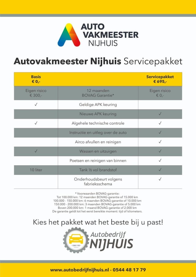 - BOVAG pakket (€ 695): HET BOVAG SERVICEPAKKET € 695,- * 12 maanden BOVAG Garantie * Nieuwe APK keuring * Algehele en technische controle * Instructie en uitleg over de auto * Airco opnieuw afvullen en reinigen * Auto poetsen en interieur reinigen * Tank half vol brandstof * Onderhoudsbeurt volgens fabrieksschema * 12 maanden Autovakmeester Nijhuis pechhulp service Europa