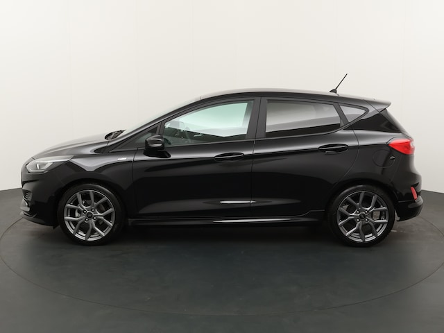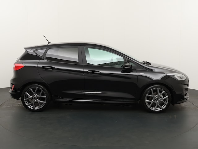 De Ford Fiesta van het nieuwe type. Al jaren lang de best sturende auto in zijn klasse. Zeker deze ST-Line met aangepast onderstel, vering en demping. Ook aan de buitenkant is meteen te zien dat dit de sportieve telg van de Fiesta familie is. De auto heeft andere bumpers voor en achter, sideskirts en speciale donkergrijze 17" lichtmetalen velgen. Ook binnen is de auto anders dan de gewone Fiesta. De sportstoelen zijn met een rood stiksel afgewerkt. Dit komen we ook tegen op het (lederen) stuurwiel, pookhoes en handremhoes. De hemelbekleding met zwart stof bekleed. Met een opvallend nieuw exterieur rijdt de iconische compacte auto stijlvol door de stad. Vooruitstrevende technologieën en veiligheid hulpsystemen als Lane assist en collision waring.