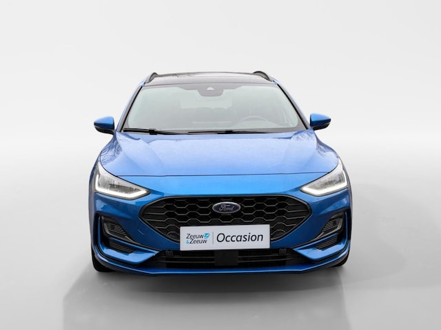 Zeer Complete Focus ST-Line X 155PK Wagon automaat in de kleur Desert Island Blue voorzien van elektrisch bedienbaar Panoramadak, afneembare Trekhaak, Driver Assistance Pack met adaptieve cruise control en dode hoek identificatie (BLIS), Winter Pack etc..