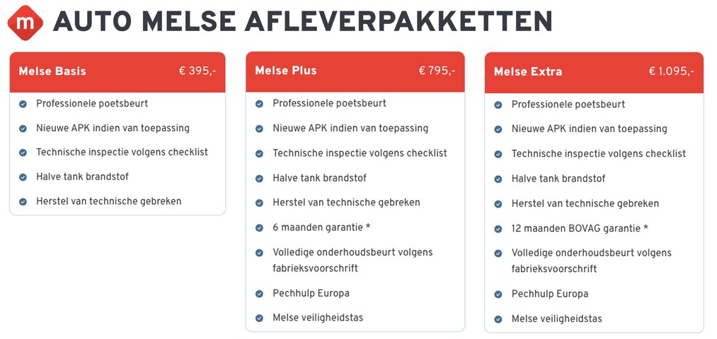 - Melse Extra (BOVAG) (€ 1.095): Het afleverpakket Extra omvat een volledige onderhoudsbeurt volgens het fabrieksonderhoudsschema en een nieuwe APK-keuring. Bovendien krijgt u 12 maanden BOVAG- garantie, Pechhulp Europa, een volledige poetsbeurt en brandstof tussen 1/4 en 1/2 tank.