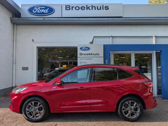Sportieve en complete Ford Kuga PHEV 225pk Hybrid Automaat ST Line in de kleur Lucid Red van 1e Eigenaar. Inclusief Styling pakket incl. Dakspoiler, Privacy Glass, 18" Lichtmetalen velgen, Compleet Digitaal Dashboord, Leder Alcantara bekleding icm. Verwarmbare Sportstoelen, Voorruitverwarming, Stuurverwarming, In hoogte verstelbare Sportstoelen, Cruise Control, Adaptieve Full LED Koplampen icm. Aut. Grootlicht assistent, Achteruitrijcamera, Parkeersensoren voor & achter, Pre-Collision Assist, Lane Centering aid, Verkeersbordherkenning, Active City stop, Wrong way Alert, Touchscreen Navigatie icm. Bluetooth Voice control & USB, Apple Car Play & Android Auto, Climate control, Elektrisch inklapbare Buitenspiegels, Keyless Entry & Starten op afstand.