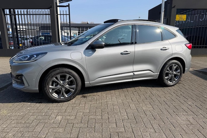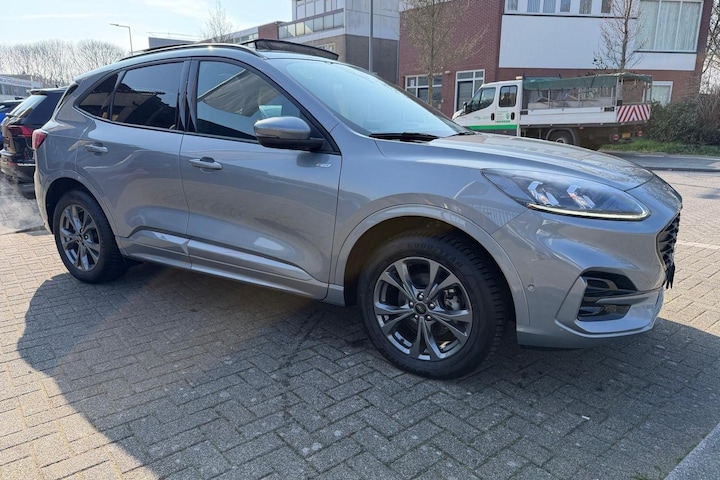 Deze jongvolwassen Ford Kuga met de nieuwste technologie aan boord is net lekker voor je ingereden. Met deze hybride Ford Kuga bent u niet voor één gat te vangen. U kunt kiezen voor elektrisch rijden of benzine. Met de voordelen van allebei. Zelfs als het buiten ijzig koud is, kunnen zowel de bestuurder als de passagiers op de achterbank snel opwarmen, dankzij de verwarmbare stuurwiel en de achterbankverwarming. Voor het pittige uiterlijk én goed gesteund zitten zorgen de sportstoelen. Het interieur lijkt groter en ruimtelijker dankzij het elektrisch bedienbare glazen panoramadak. De elektrische achterklep opent met een druk op de knop, zodat jij gemakkelijk toegang heeft tot de bagageruimte. Bij de rijke uitrusting horen ook 18 inch lichtmetalen velgen, LED koplampen, sportonderstel, geluidsisolerende ramen, in delen neerklapbare achterbank en LED-achterlichten.