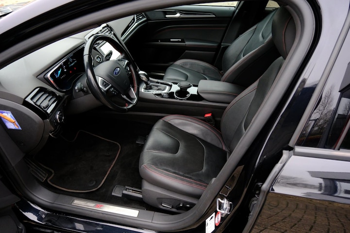 Deze zeer exclusieve Mondeo automaat is afkomstig van 1e eigenaar! Rijden in een Ford betekent toekomstgericht de weg op gaan. Een stapje meer doen, de voorsprong pakken. Go Further, zoals ze zelf zeggen. De aandrijving van deze Ford wordt verzorgd door een viercilinder motor en een automatische transmissie. Dak dicht? Dan toch volop daglicht door het elektrisch bediende glazen panorama dak. Het lederen interieur ademt luxe en de elektrisch bedienbare achterklep biedt volop gemak. In dit voertuig hoeft u nooit meer kou te lijden dankzij functies als stoelverwarming en verwarmbare achterbank, evenals een verwarmbaar stuur. Laat die bochten maar komen! In de sportstoelen zitten u en uw bijrijder altijd goed! U wordt in deze auto ook getrakteerd op 18 inch lichtmetalen velgen, LED koplampen, sportonderstel, warmtewerend glas, in delen neerklapbare achterbank en LED-achterlichten.