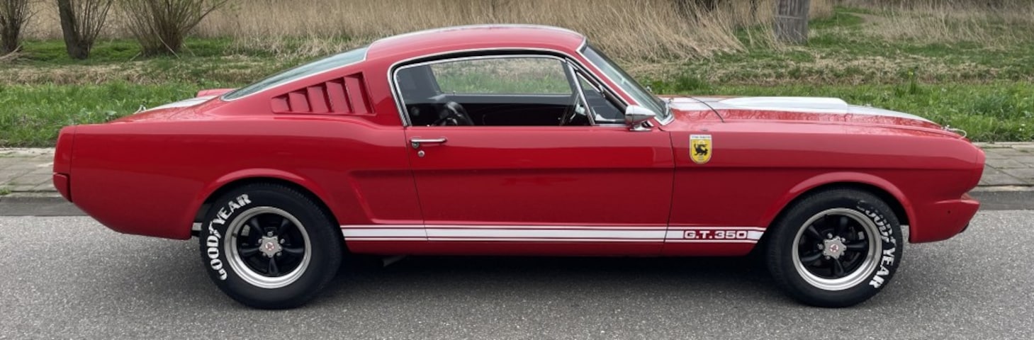 Deze Ford Mustang Fastback uit 66 is 20 jaar van dezelfde eigenaar geweest die hem door de jaren heen geheel omgetoverd heeft naar een GT350. Niet alleen optisch maar zeker ook technisch, de 289 K code High performance V8 van 300PK. De motor is gereviseerd 22K mile terug en uitgevoerd met de ontsteking met dubbele contactpunten en de klepdeksels zijn van een originele GT350 Shelby racer. Gekoppeld aan een gereviseerde Top loader vierbak. Zelfs de zwaarder swaybar zit gemonteerd onder deze mustang. Een nieuwe benzinetank met de vultrechter zoals het hoort in de GT. Zelfs de toerenteller en de radio afdekplaat zijn origineel Shelby. In het restauratie verslag kun je zien dat hij nog de originele vloeren heeft en dat ze gaaf zijn. Ook op de foto’s zie je alle puntlassen zitten. Wij hebben de onderkant gelaten zoals hij is na 20 jaar gebruik, erg mooi maar sporen van gebruik. Het is aan de volgende eigenaar om dat op te frissen of zo te laten. Het verslag komt natuurlijk met de auto mee. Het interieur is smetteloos en origineel, de zeer nette achterbank zit onder een zeil alsof het een originele GT is en het reservewiel ligt er op met de originele montage. De body is strak met goede pasvormen en staat zeer netjes in de lak. De Mustang heeft een Nederlands kenteken.
