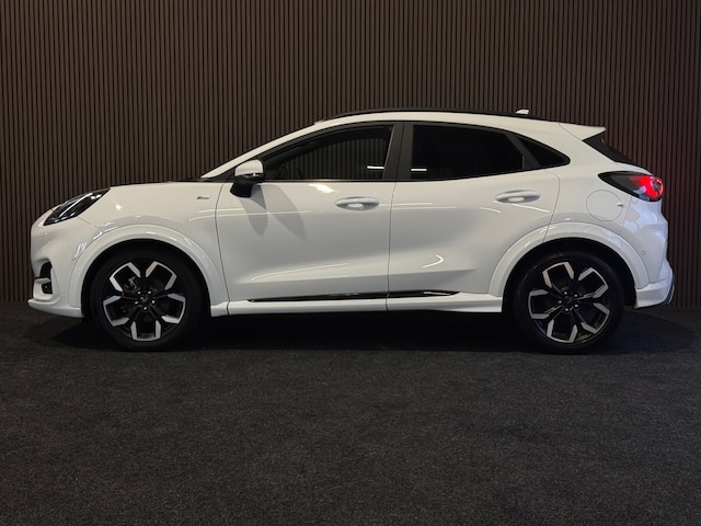 een sportief uitgevoerde Ford Puma 1.0 EcoBoost Hybrid ST-Line uit 2021 in frisse witte lak. Deze Puma combineert het dynamische karakter van de ST-Line met de efficiëntie van een hybride aandrijflijn en het comfort van een automatische transmissie.
