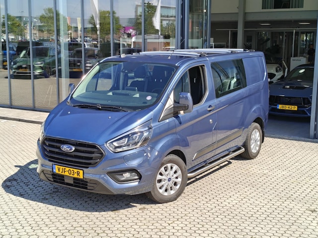 Unieke Transit Custom Benzine Plug in Hybride, uitgevoerd met een dubbele cabine en de luxe kleur Chrome Blue.