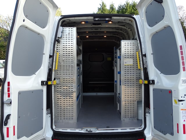 Deze Transit is uitgerust met een hoogwaardige Sortimo-inrichting, inclusief stroomvoorziening, waardoor gereedschap, materiaal en apparatuur veilig en overzichtelijk kunnen worden meegenomen.