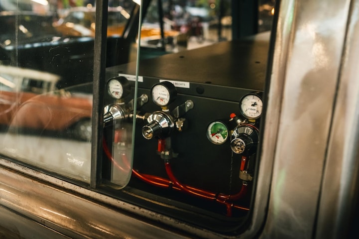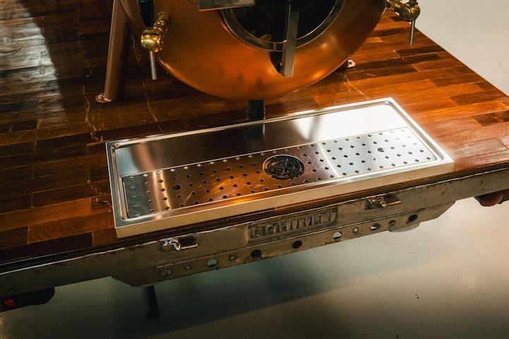 Die Zapfanlage wurde professionell installiert und für zuverlässigen, intensiven Einsatz konzipiert. Die integrierte Kühlanlage bietet Platz für sechs kompakte Bierfässer, die direkt angeschlossen werden können. Über den CO2-Anschluss wird eine gleichbleibende Zapfqualität gewährleistet. Am hinteren Teil des Kupfertanks befinden sich zwei Zapfhähne, mit denen zwei verschiedene Biere gleichzeitig gezapft werden können.