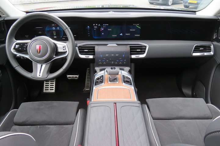 Wat ook opvalt, is de strakke en overzichtelijke informatie die het digitale dashboard levert. De vier camera's genereren samen een 360 graden beeld rond de auto, zodat je een volledig overzicht hebt van wat er rondom jouw auto gebeurt. Met adaptive cruise control houdt de auto zelfstandig afstand tot jouw voorligger. Een veiligheidsverhogende optie waarmee je comfortabel onderweg bent. De bediening van het audio-installatiesysteem en het full map navigatiesysteem gebeurt met knoppen op het stuur en als jij wilt zelfs met jouw stem. Deze Hongqi E-HS9 is een complete auto anno nu, en dat merk je. Bijvoorbeeld door de aanwezige draadloze oplaadmogelijkheid voor telefoons. De uitrusting van deze Hongqi is met kruisend verkeer detectie, Alcantara - lederen bekleding, keyless entry en automatisch dimmende binnenspiegel behoorlijk compleet.