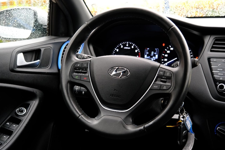 Twijfelen hoeveel ruimte u achter de auto heeft? Met de achteruitrijcamera weet u altijd hoeveel centimeter! Een optie die de veiligheid verhoogt, is de bediening vanaf het stuur van het audiosysteem (met DAB-radio!) en het navigatiesysteem. Ook over uw schouder ziet u onderweg niet alles wat er aan de achterzijde gebeurt. Daarom heeft deze Hyundai I20 een achteropkomend verkeer waarschuwing. Achter het stuur van deze Hyundai bent u niet alleen. De auto kijkt als het ware met u mee tijdens de rit. De regensensor schakelt de ruitenwissers in als het nodig is en de automatisch inschakelbare verlichting doet de lichten voor u aan. Meer rijcomfort en minder brandstofgebruik? Even de cruise control instellen en dan ontspannen rijden! Wat u ook in deze auto kunt vinden zijn airconditioning, lederen stuur, centrale deurvergrendeling met afstandsbediening, boordcomputer en lederen versnellingspook.