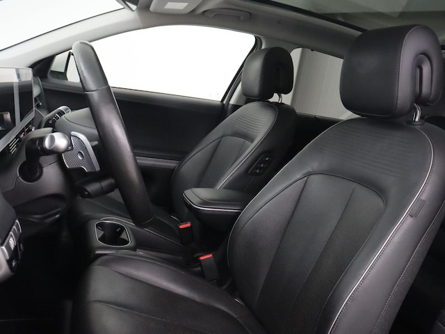 Bij Hyundai geldt het motto 'New Thinking. New Possibilities'. En dat merk je aan ieder model. Fiscaal aantrekkelijk is de elektromotor, waarmee u niet alleen stil maar ook uitermate pittig kunt rijden. De auto is voorzien van een mooie en comfortabele lederen bekleding. Zit u goed? De stoelen zijn eenvoudig instelbaar dankzij de elektrische bediening met geheugen. Zelfs als het buiten ijzig koud is, kunnen zowel de bestuurder als de passagiers op de achterbank snel opwarmen, dankzij de verwarmbare stuurwiel en de achterbankverwarming. De achterklep opent automatisch met een druk op de knop. Handig als u met volle handen staat. Geniet van de lichtinval en het uitzicht van het grote glazen panoramadak. Verder is de Hyundai uitgerust met: 20 inch lichtmetalen velgen, Full LED koplampen, extra getint glas, in delen neerklapbare achterbank, LED-achterlichten en verstelbare lendensteunen.