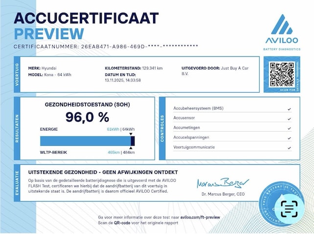 Tevens worden al onze elektrische auto's afgeleverd met een gepatenteerde batterijtest, uitgevoerd door Aviloo. Dit biedt een snelle en betrouwbare manier om de prestatiewaarde van een tractiebatterij in een elektrisch voertuig te bepalen. Voor de test worden bepaalde parameters van de batterij gemeten.