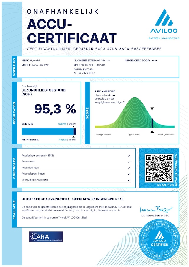 Mooie Hyundai Kona EV Fashion 64kWh 2020. Aviloo batterij test SOH score van 95%. Zie foto's voor rapport.
