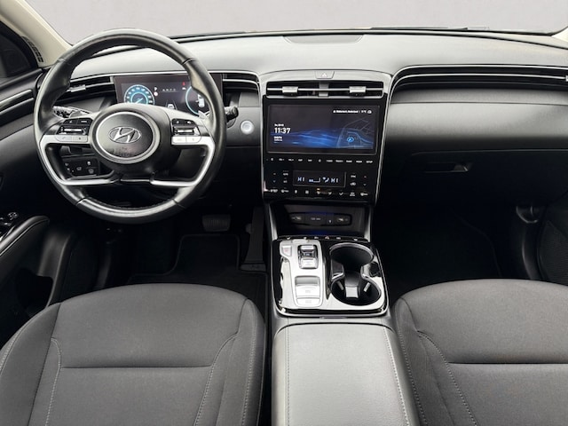 Deze auto is voorzien van een digitaal dashboard waarmee u de cockpit-interface kunt personaliseren. Wat een gemak, die achteruitrijcamera. Alles in beeld zonder capriolen. Met adaptive cruise control houdt de auto zelfstandig afstand tot uw voorligger. Een veiligheidsverhogende optie waarmee u comfortabel onderweg bent. Na een lange werkdag in de file: daar zit niemand op te wachten. Gelukkig helpt de file assistent een handje. Het radarsysteem meet de ruimte tot de voorligger en bewaakt de juiste afstand. Stilstaan? Dan remt en stopt de auto vanzelf. Deze Hyundai Tucson is 'connected'. Belangrijke functies worden permanent gemeten en zijn uit te lezen via een speciale app, ook op afstand. Deze auto is voorzien van dashboard met spraakbediening, premium audiosysteem, full map navigatiesysteem, kruisend verkeer detectie, automatische airconditioning en schakelpaddles aan het stuur.