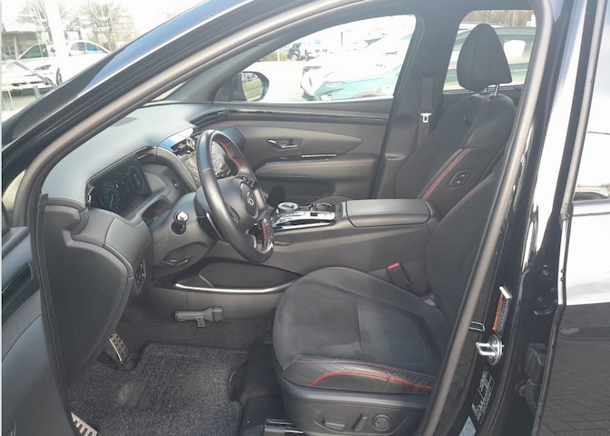 De sportstoelen in de TUCSON N Line zijn voorzien van het N-logo, bekleed met zwart suède en leder, en afgewerkt met rood stiksel. Het rode stiksel komt terug in de deurbekleding en de armleuning. De met grijze stof beklede zachte rand over het dashboard is voorzien van rode accenten. Het speciale N-stuurwiel is verfraaid met het N-logo. Andere elementen in N-design zijn te vinden op de met leder beklede knop van de transmissiehendel ofwel de deksel van de shift-by-wire-console – afhankelijk van de gekozen transmissie. De zwarte hemelbekleding verleent het interieur een sportieve sfeer. Andere N Line-elementen zijn de metalen pedalen, voetsteun en dorpelpanelen.