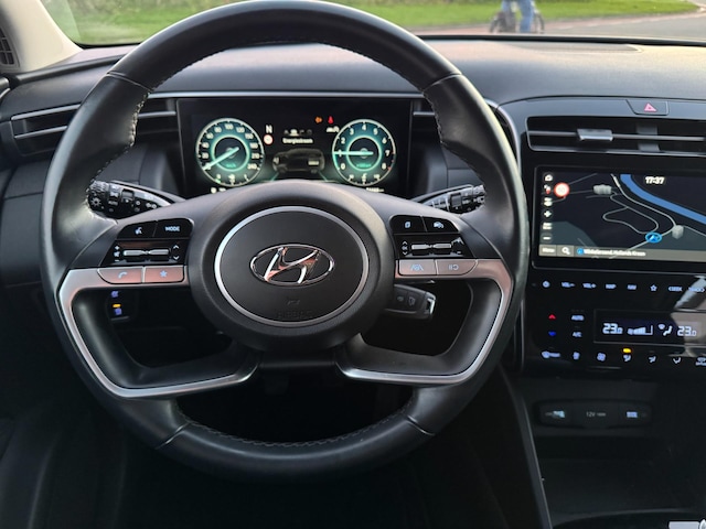 De 360 graden camera biedt een beter zicht bij slechte weersomstandigheden, waardoor u beter kan anticiperen op mogelijke gevaren. Adaptive cruise control is veilig en comfortabel. De snelheidsregelaar houdt automatisch afstand tot het voertuig dat voor u rijdt. Muziek luisteren wordt genieten met het high performance audiosysteem. Prettig, altijd weten waar je moet zijn en hoe lang de rit nog duurt met het navigatiesysteem. Ook over uw schouder ziet u onderweg niet alles wat er aan de achterzijde gebeurt. Daarom heeft deze Hyundai TUCSON een achteropkomend verkeer waarschuwing. Wat u ook in deze auto kunt vinden zijn automatische airconditioning, draadloos opladen, DAB ontvangst, regensensor, keyless entry en automatisch dimmende binnenspiegel.
