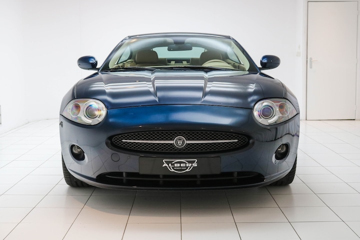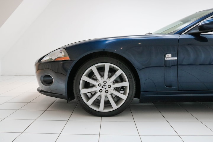De auto is uitgevoerd in Indigo Blue Metallic, een diepe metallic lak die de lijnen van de XK mooi laat uitkomen. De chroom sierlijsten geven het geheel een luxe uitstraling en de originele velgen maken het plaatje compleet. Daarnaast is de auto voorzien van parkeersensoren voor en achter, wat het inparkeren een stuk makkelijker maakt.