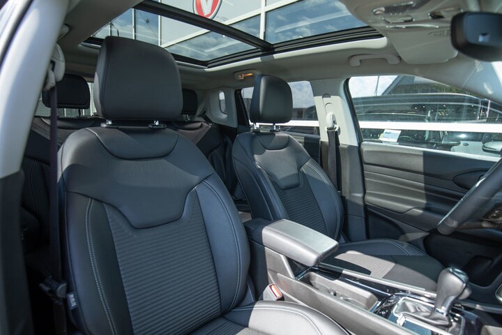 This Jeep Compass 4xe in the luxurious Limited trim combines style, comfort, and modern technology in a unique way. The car features a contrasting black roof and refined chrome accents, giving it an elegant and sporty look. The panoramic sunroof creates a spacious and airy feel inside, while the semi-leather seats with power-adjustable lumbar supports ensure optimal seating comfort, even on longer drives.