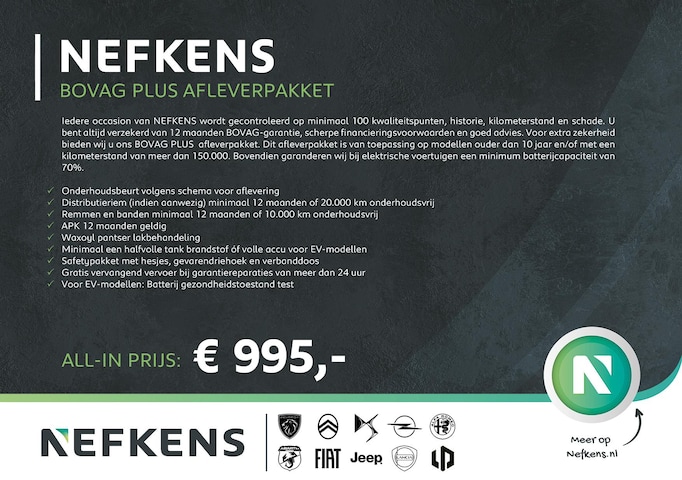 Iedere occasion van NEFKENS wordt gecontroleerd op minimaal 100 kwaliteitspunten, inclusief historie, kilometerstand en eventuele schade. U profiteert altijd van 12 maanden BOVAG-garantie, aantrekkelijke financieringsmogelijkheden en deskundig advies. Voor extra zekerheid bieden wij ons Essential / Advanced afleverpakket aan, inclusief uitgebreide controles en service. Dit afleverpakket is van toepassing op modellen van 2 tot 10 jaar oud en/of met een kilometerstand tussen 50.000 en 150.000. Bovendien garanderen wij bij elektrische voertuigen een minimum batterijcapaciteit van 70%.