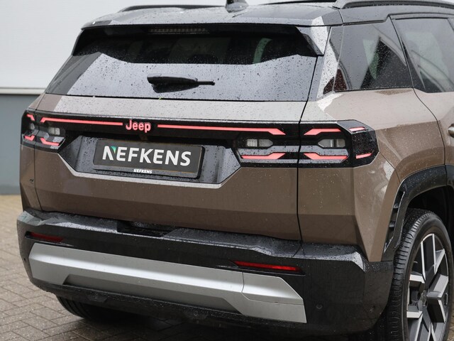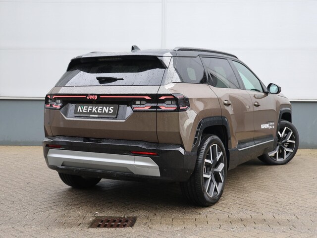 Hij biedt volop ruimte, deze Jeep Compass, en dankzij zijn elektrische aandrijving is er ook plenty vermogen voor een dynamische rijstijl. De modernste techniek is toegepast om u in alle rust en stilte van de rit te laten genieten. Daarbij zult u zien dat de tijd om de accu's op te laden enorm meevalt, en dankzij de flinke actieradius hoeft u dat ook niet zo vaak te doen. Dit is een splinternieuwe auto, die nu uit voorraad leverbaar is. De verwarmbare voorstoelen inclusief massagefunctie benadrukken nog maar eens dat we hier te maken hebben met een regelrechte verwenauto. Comfort, licht en het complete gevoel van ruimte wordt verzorgd door het elektrisch bediende panoramadak. Met een druk op de knop gaat de elektrische achterklep open. Opwarmen in koude dagen? Pak het verwarmd stuurwiel met beide handen aan! Daglicht bij nacht? De koplampen met matrix LED-verlichting zorgen ervoor. Bij de uitrusting van deze Jeep horen onder meer 20 inch lichtmetalen velgen, extra getint glas, verwarmde ruitensproeiers en snelheidsafhankelijke stuurbekrachtiging.