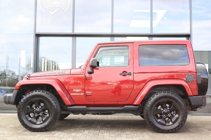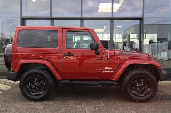 Unieke Jeep Wrangler 2 drs JK Sahara 4x4 Automaat in de kleur Deep Cherry Red met een zwart lederen interieur.