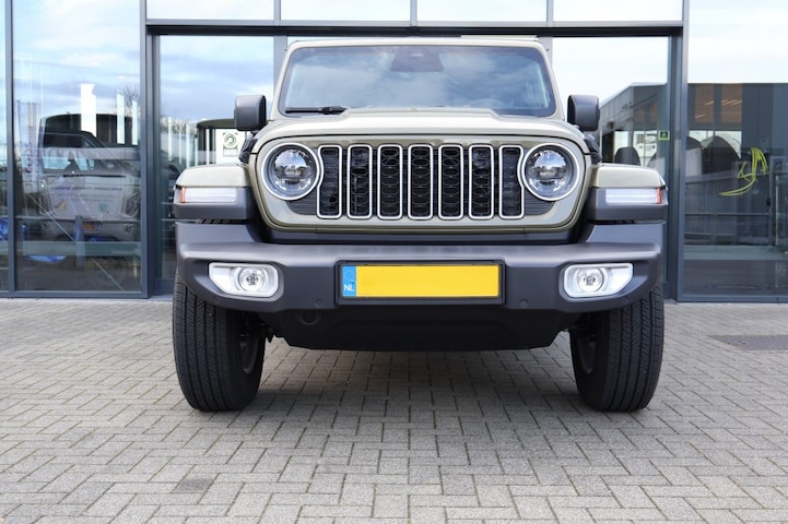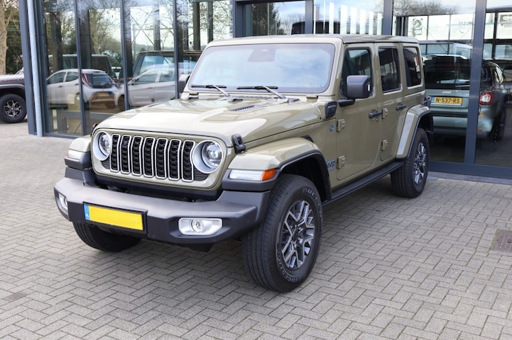 Betreft een nieuwe Jeep Wrangler 4XE Sahara 4x4 in de speciale groene kleur '41, Olive Drab. Deze kleur groen is een eerbetoon aan de originele Willys MB militaire jeeps.