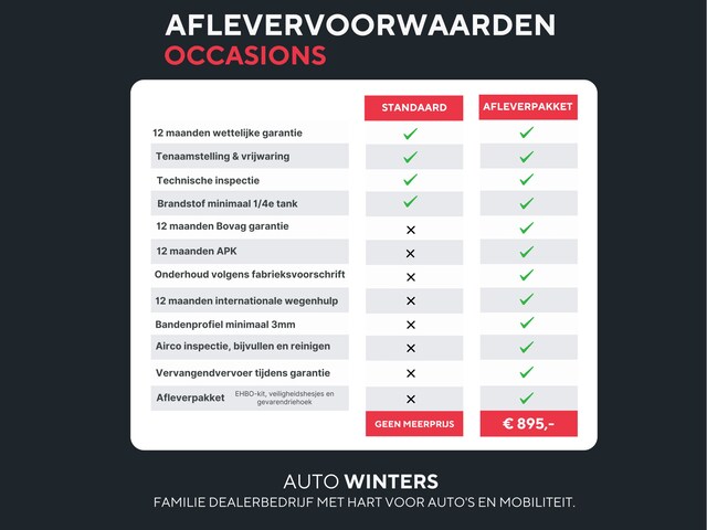 Alle moeite is genomen om de informatie in deze advertentie zo accuraat en actueel mogelijk weer te geven. Fouten zijn echter nooit uit te sluiten. Vertrouw daarom niet alleen op deze informatie, maar controleer bij aankoop de zaken die uw beslissing zouden kunnen beïnvloeden. Auto Winters sluit iedere aansprakelijkheid voor de in deze advertentie verstrekte informatie uitdrukkelijk uit. Gepresenteerde auto's kunnen op diverse locaties staan, neem van te voren contact op om zeker te zijn van de locatie.