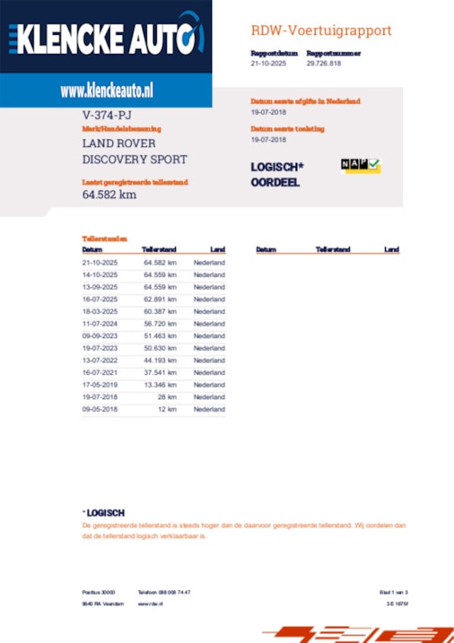Kilometerstand slechts 64.582km met NAP (Nationale Auto Pas)