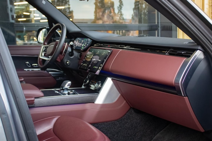Het interieur is een toonbeeld van Britse luxe – uitgevoerd in diep bordeauxrood leder, inclusief hemelbekleding in dezelfde tint. De combinatie met donkermat houten inleg en het glazen panoramadak creëert een warme, exclusieve sfeer aan boord.